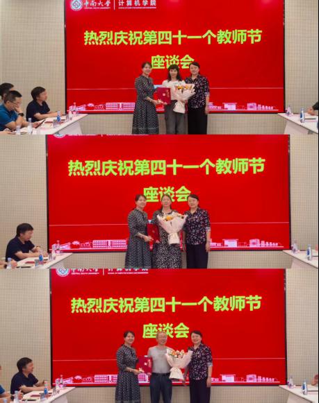 接下来,两位教师代表为李敏院长进行“最美教师”献花仪式,赵晓霞书记和李敏院长为从教三十年教师代表进行献花仪式,冯启龙副院长为新进青年教师进行纪念品颁发仪式。
