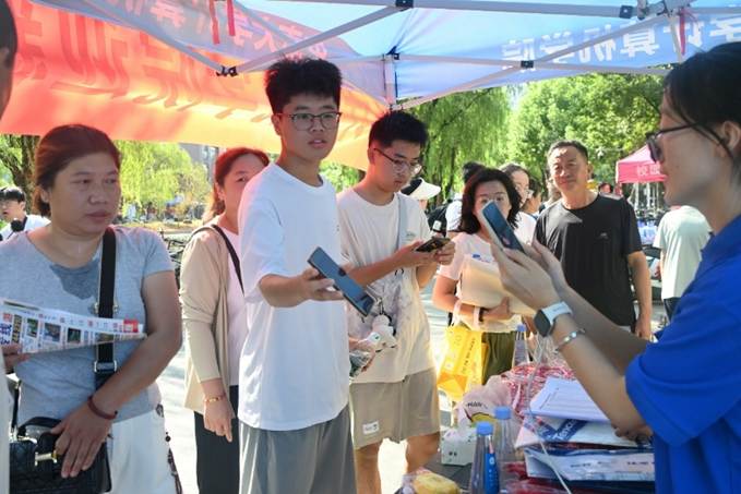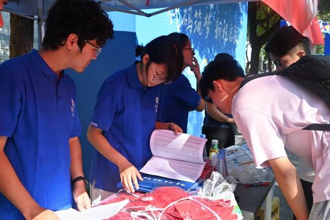 早上7点,身着统一服装的志愿者队伍已集结完毕。炎炎烈日下,从校门口的行李搬运、路线引导,到报到点的信息核对、物资发放、生活答疑,学生志愿者始终热情地为新生提供全流程帮助。