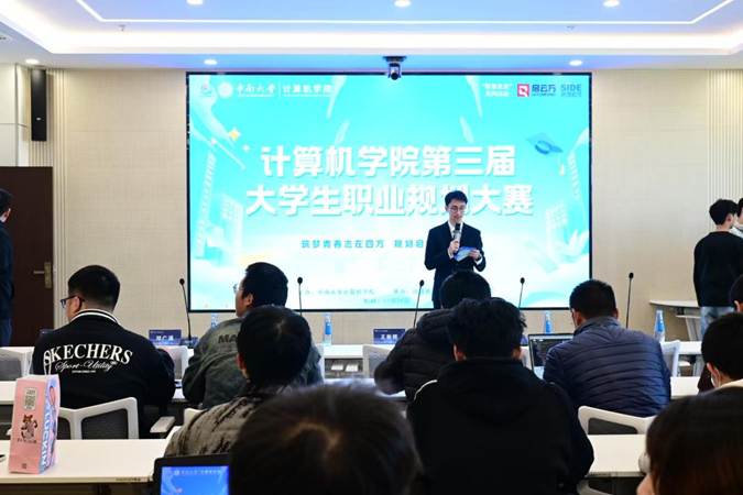 王新辉为本次大学生职业规划大赛作总结讲话。他围绕计算机专业学生在答辩实践、实习经历和自我认知提升等方面,强调要善于借势借力,重视评委建议,提升动手能力,积极参与企业实习,以增强就业竞争力,并鼓励学生从大一就开始规划职业发展路径,通过比赛和实训不断提高认知水平和综合能力。